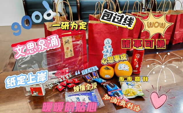 “考研加油包”由学院向阳花爱心志愿服务队组织打包,其中包含了文具、水果、零食等,预祝2026届全体考研学子“文”思泉涌、诸事“可乐”、心想“柿”“橙”、运气“旺旺”、“纸”定上岸!在这个冬天,收获璀璨硕果!