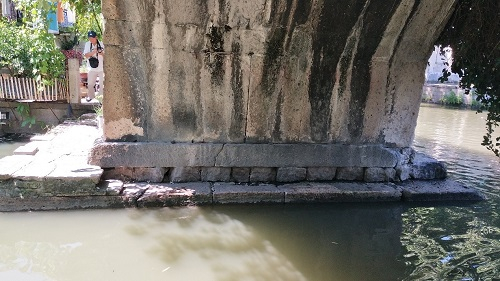 营员们参观的第一座桥“龙华桥”是绍兴市级文物保护单位,于明崇祯三年重建,单孔石梁桥。石条横砌的桥墩中夹有直立石槽,此桥为绍兴城内仅存的闸桥,是绍兴城内古代调节水位的重要闸桥。